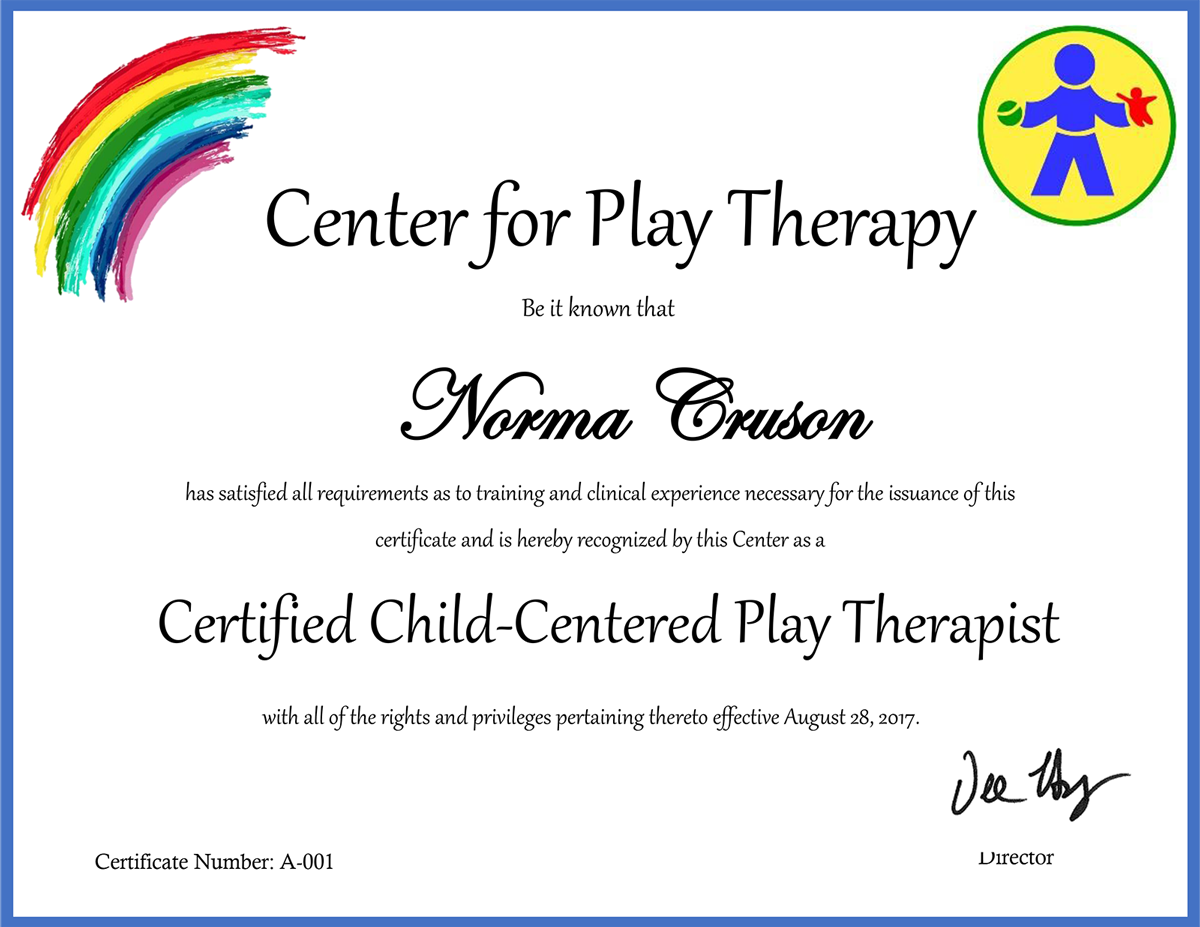 Not only did I recently earn this Certificate from the University of North Texas Center for Play Therapy , I'm beyond honored to say that I am the very first to complete this program and receive the title of Certified Child-Centered Play Therapist from UNT...